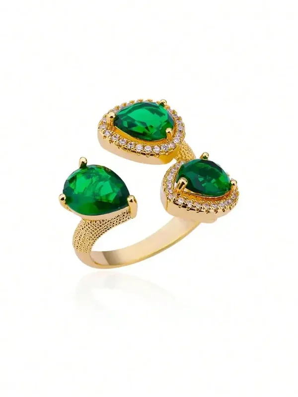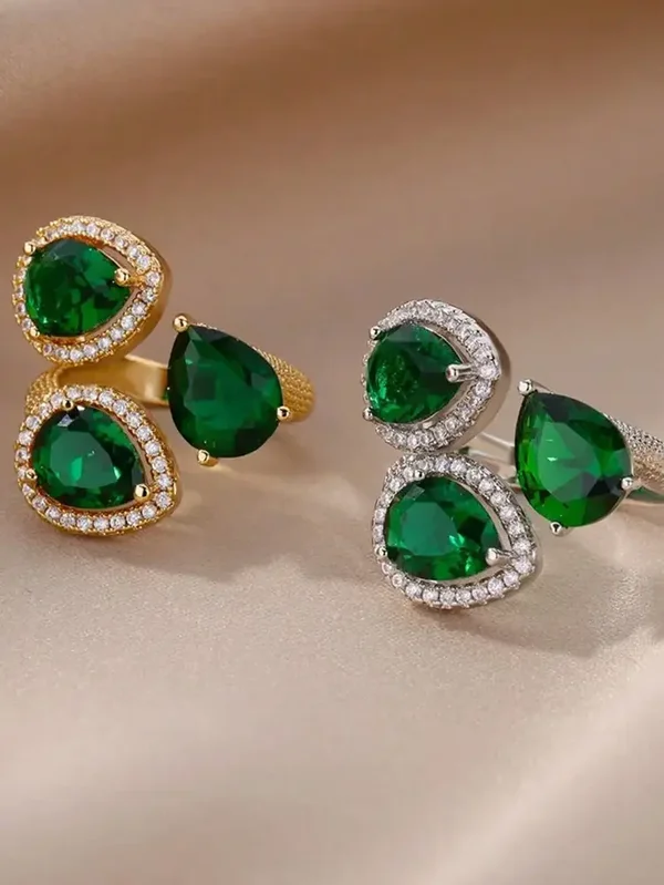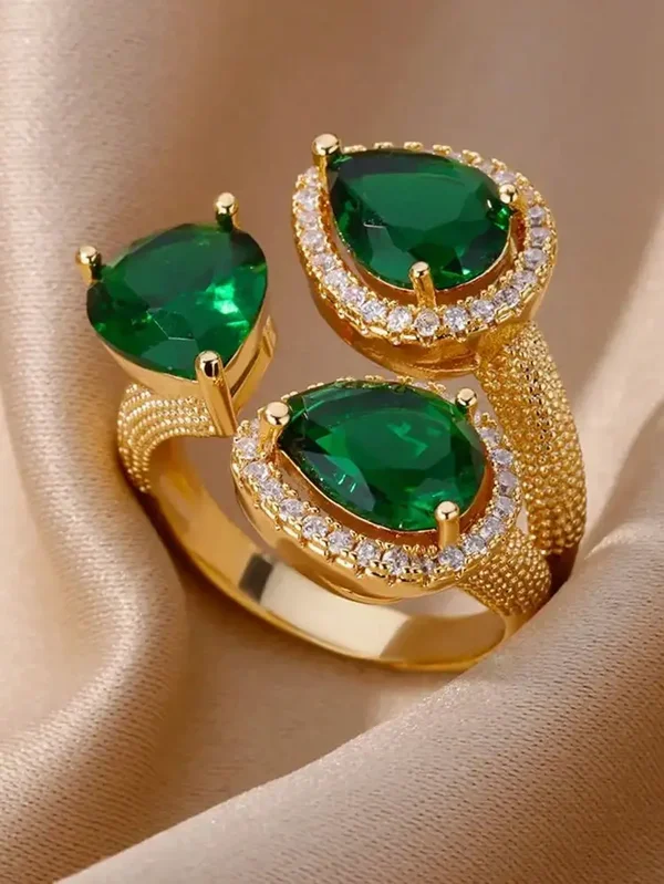 Bague en acier inoxydable plaquée or pour femmes avec anneau d'ouverture en goutte d'eau verte